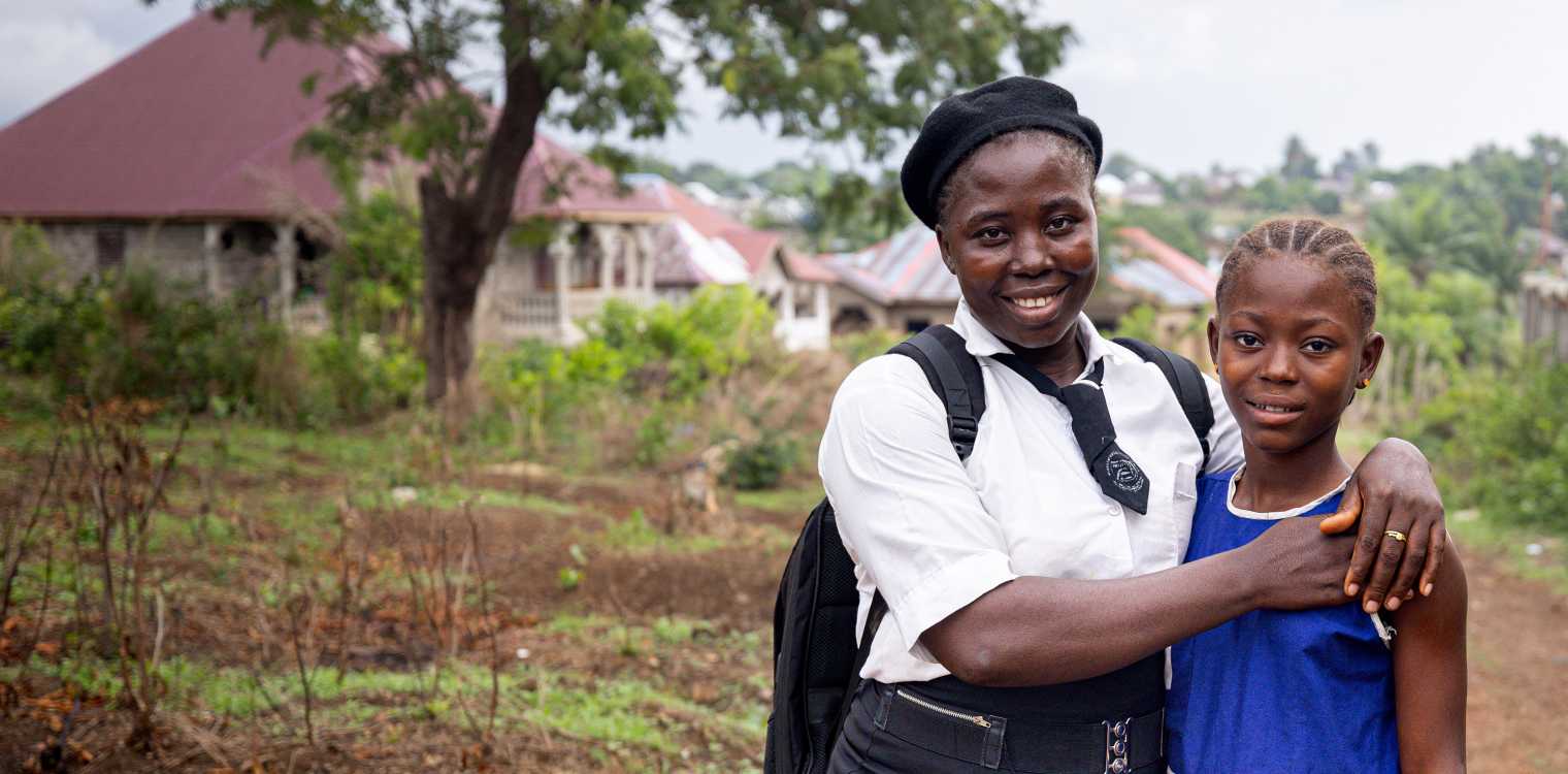 Look at those smiles! Posseh Kamara (right) is so proud and happy to be back in school after several years of challenges. She is pictured with her best friend, Mariama Fatmata K...